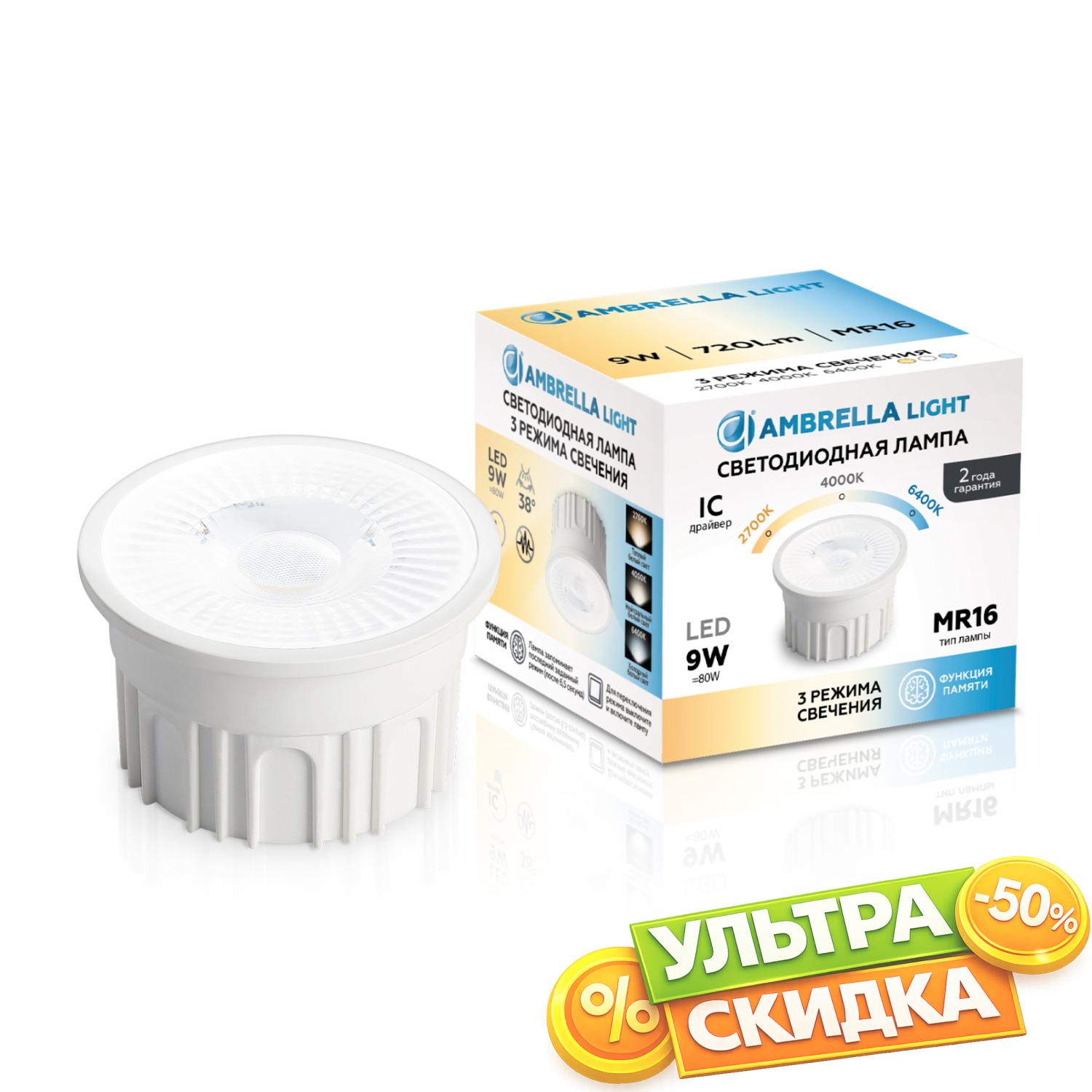 Купить 212601 Лампа LED MR16-PR 9W IC 220-240V 38° 6400K 4000K 2700K CCT Memory в интернет-магазине ЛюстраНаДом со скидкой и кешбеком. Работаем с НДС, доставляем на дом и в ПВЗ. Продажа Ambrella light 212601 BULBING осуществляется с доставкой по Москве и регионам России бесплатно от 5000 р.