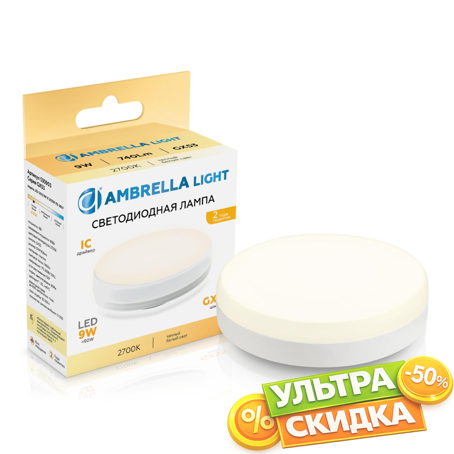 Купить 530903 LED GX53 9W IC 2700K 175-265V Светодиодная лампа GX53 9W 2700K в интернет-магазине ЛюстраНаДом со скидкой и кешбеком. Работаем с НДС, доставляем на дом и в ПВЗ. Продажа Ambrella light 530903 GX53 осуществляется с доставкой по Москве и регионам России бесплатно от 5000 р.