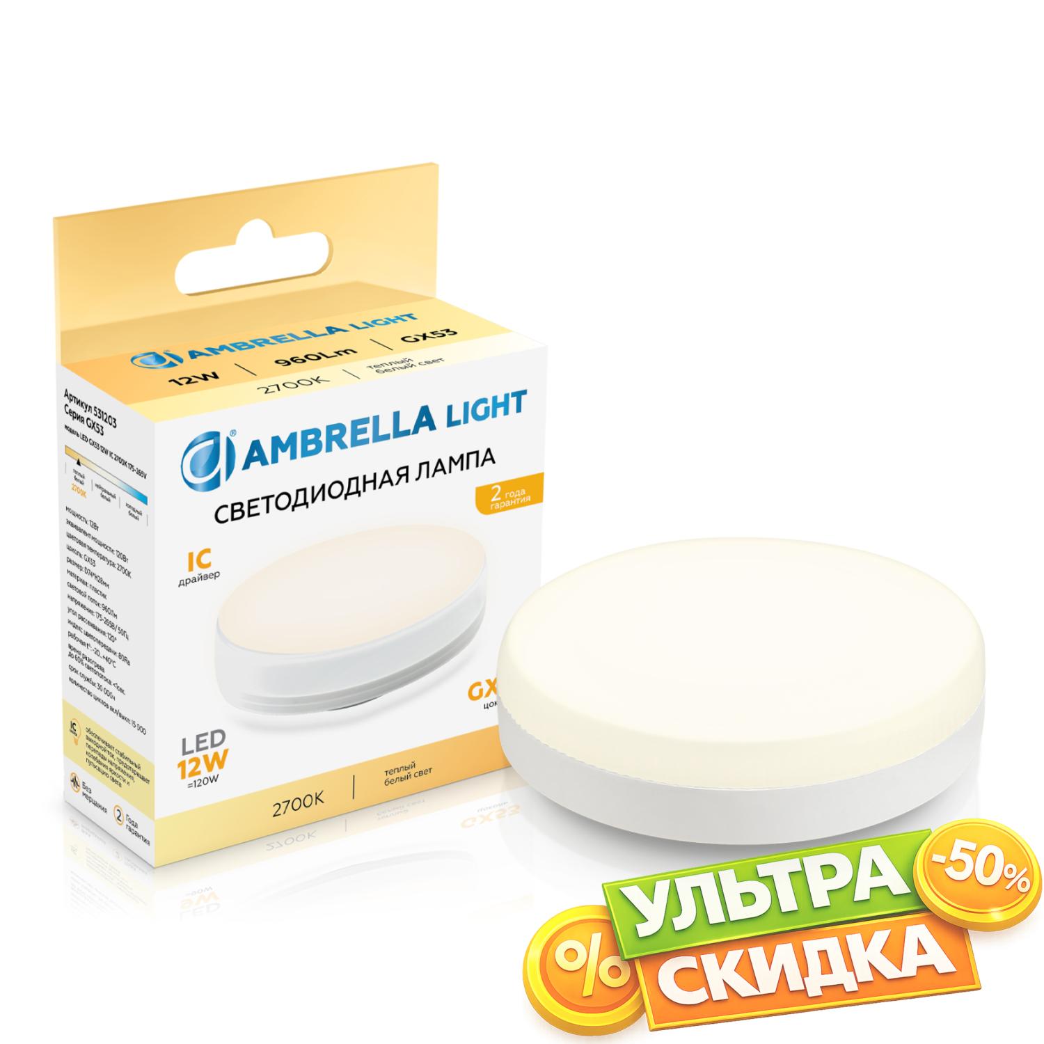 Купить 531203 LED GX53 12W IC 2700K 175-265V Светодиодная лампа GX53 12W 2700K в интернет-магазине ЛюстраНаДом со скидкой и кешбеком. Работаем с НДС, доставляем на дом и в ПВЗ. Продажа Ambrella light 531203 GX53 осуществляется с доставкой по Москве и регионам России бесплатно от 5000 р.
