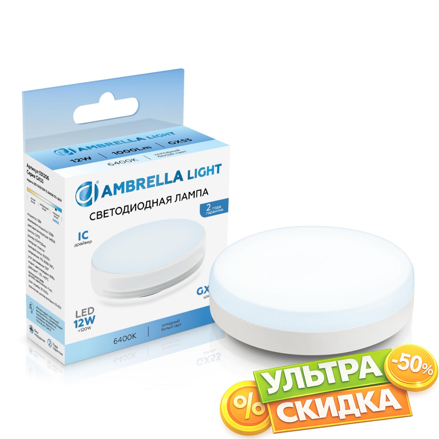 Купить 531206 LED GX53 12W IC 6400K 175-265V Светодиодная лампа GX53 12W 6400K в интернет-магазине ЛюстраНаДом со скидкой и кешбеком. Работаем с НДС, доставляем на дом и в ПВЗ. Продажа Ambrella light 531206 GX53 осуществляется с доставкой по Москве и регионам России бесплатно от 5000 р.