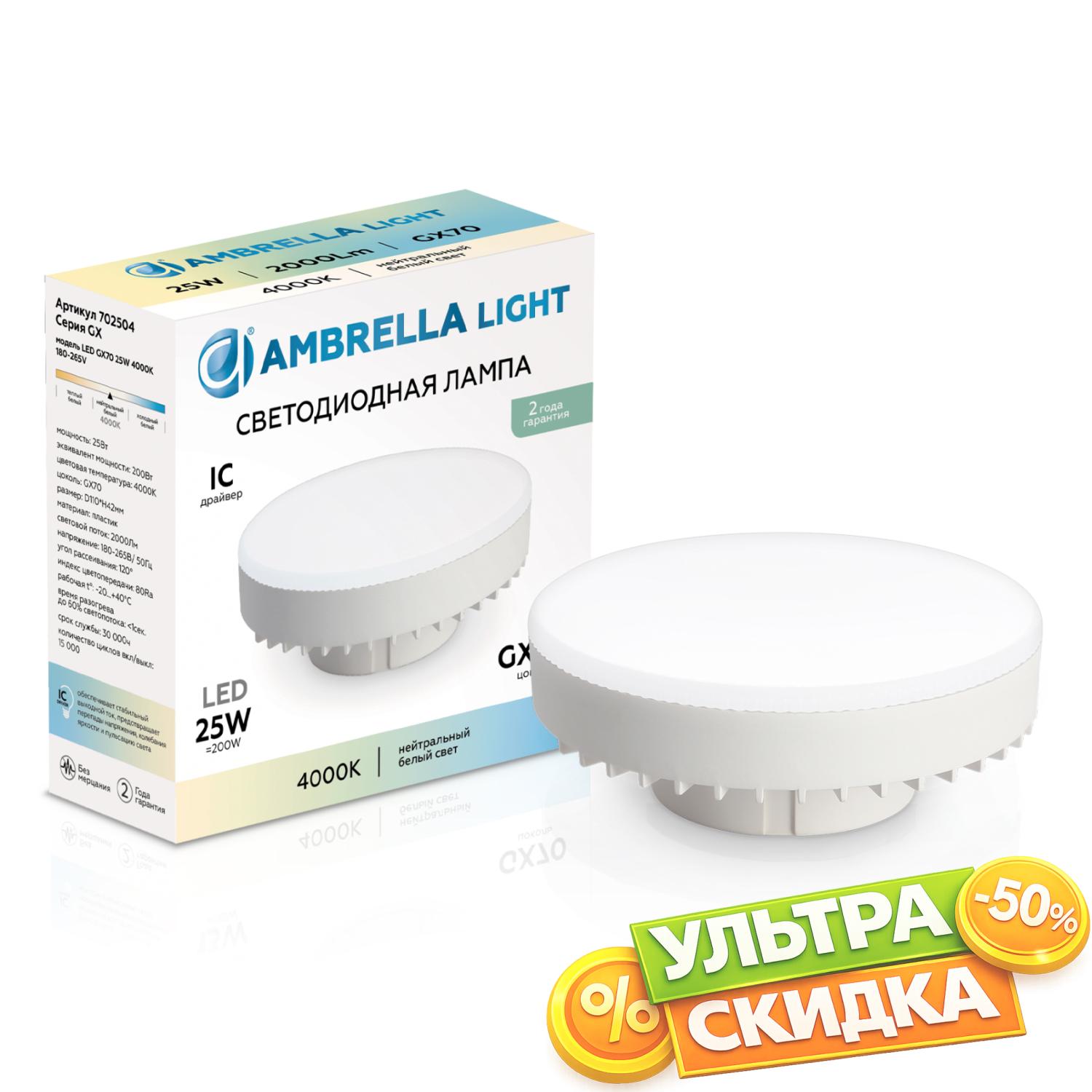 Купить 702504 LED GX70 25W IC 4000K 180-265V в интернет-магазине ЛюстраНаДом со скидкой и кешбеком. Работаем с НДС, доставляем на дом и в ПВЗ. Продажа Ambrella light 702504 BULBING осуществляется с доставкой по Москве и регионам России бесплатно от 5000 р.
