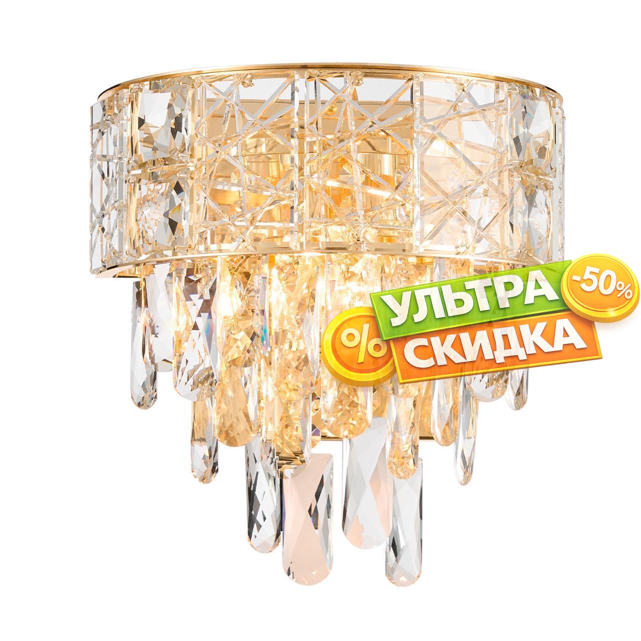 | Описание светильника | Каркас из металла золотого цвета, декоративный ободок из стеклянных пластин с узором, каскад из прозрачного хрусталя высшего качества, лампы накаливания с возможностью замены. |