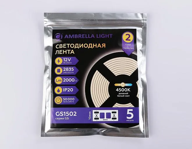 Купить GS1502 2835 240Led/ 19.2W m/ 12V IP20 4500K/ 5000*10*1.2mm (2 конт.) Светодиодная лента Ambrella Light GS1502 2835 240Led /19.2W m/12V IP20 4500K 5m/кратность резки 25mm в интернет-магазине ЛюстраНаДом со скидкой и кешбеком. Работаем с НДС, доставляем на дом и в ПВЗ. Продажа Ambrella light GS1502 GS осуществляется с доставкой по Москве и регионам России.