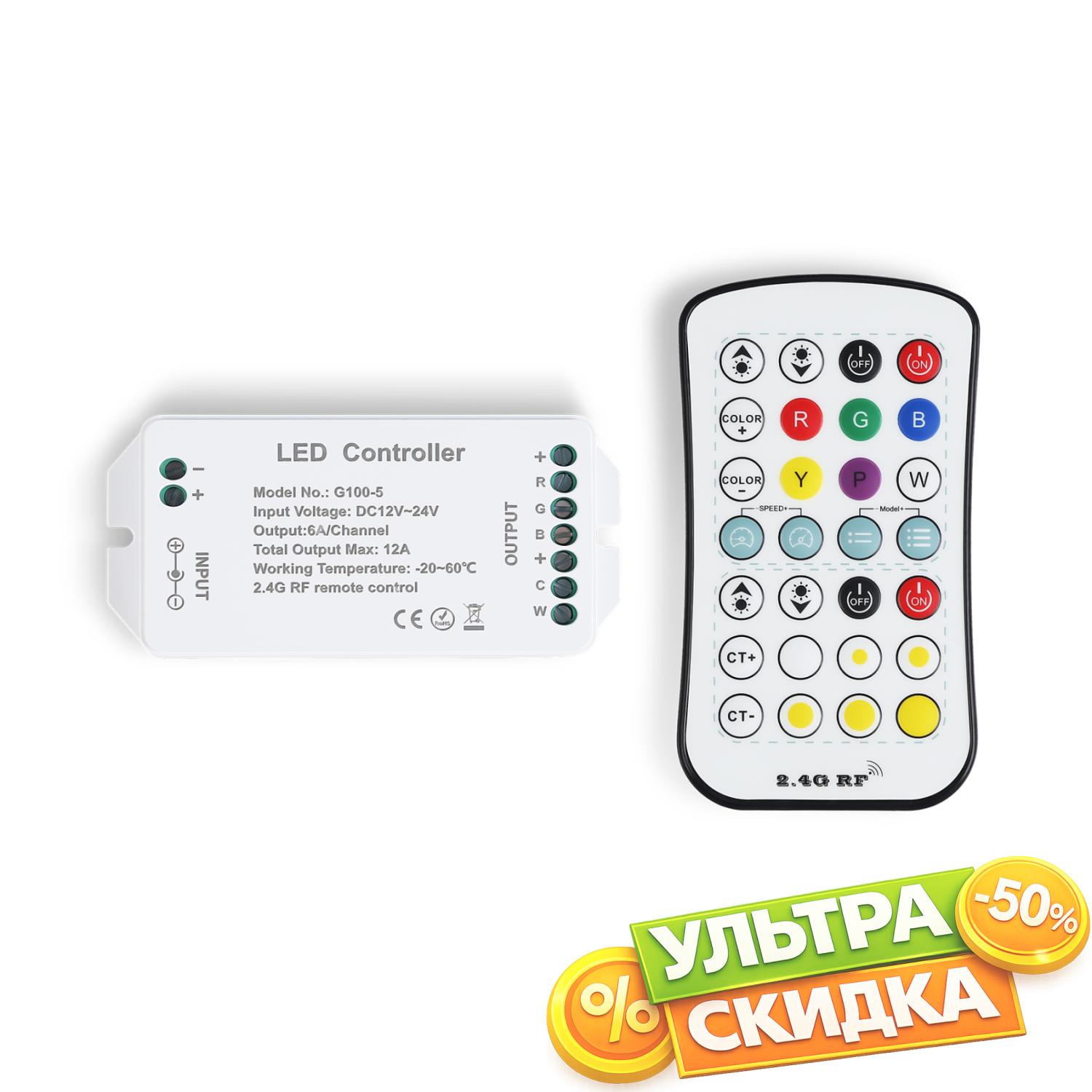 | Комплектация и упаковка/Комплектация | Контроллер для светодиодных лент, пульт радио 2.4G (батарейки CR2025 не в комплекте) |