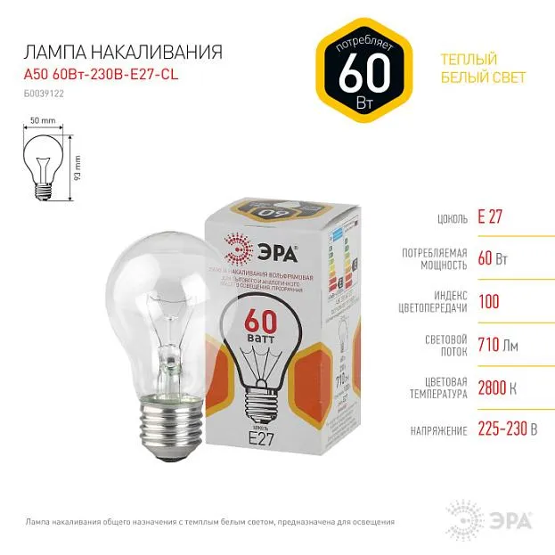 Лампочка накаливания ЭРА Б230-60-4