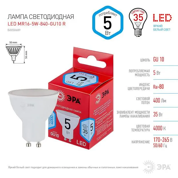 Лампочка светодиодная ЭРА LED MR16-5W-840-GU10 R