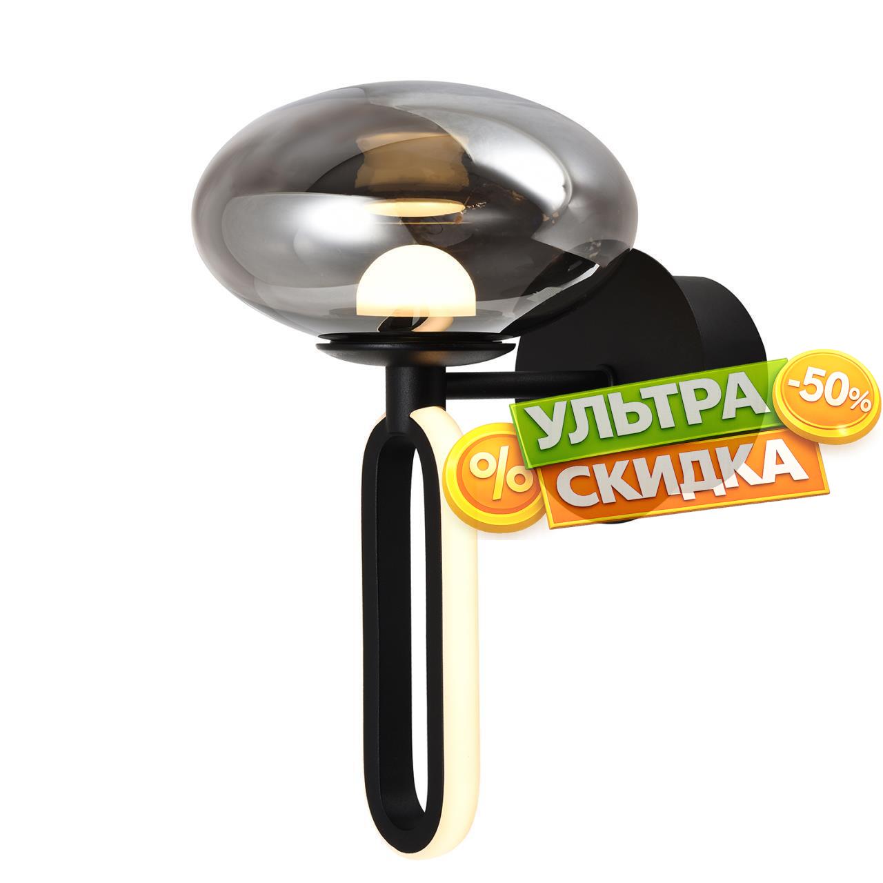 | Описание светильника | Металлический каркас в черном цвете с выдувным стеклянным плафоном, внутри расположен LEDмодуль с закругленным акриловым рассеивателем, декоративный элемент с LEDлентой по внешнему периметру. |