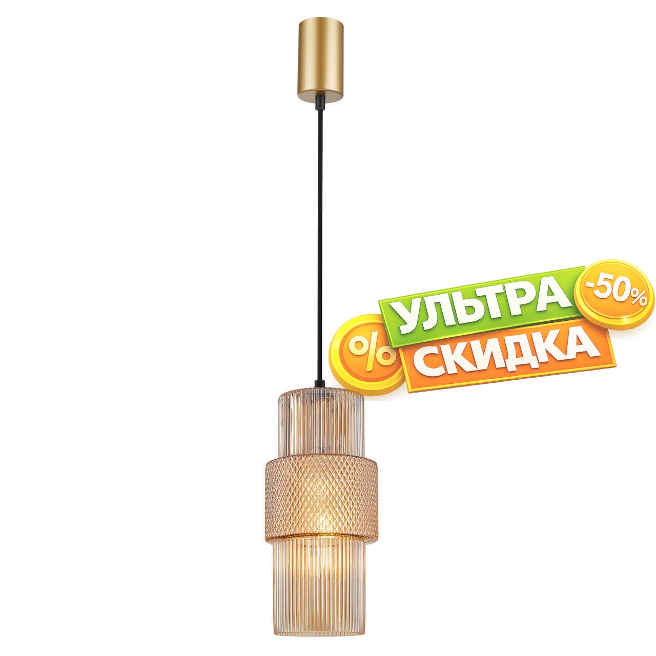 | Описание светильника | Подвес с каркасом в цвете латунь, плафон из стекла в янтарном цвете имеет вертикальные линии и ребристую текстуру с "поясом" из ромбиков поясом по центру. Цоколь E27, регулируемая высота. |