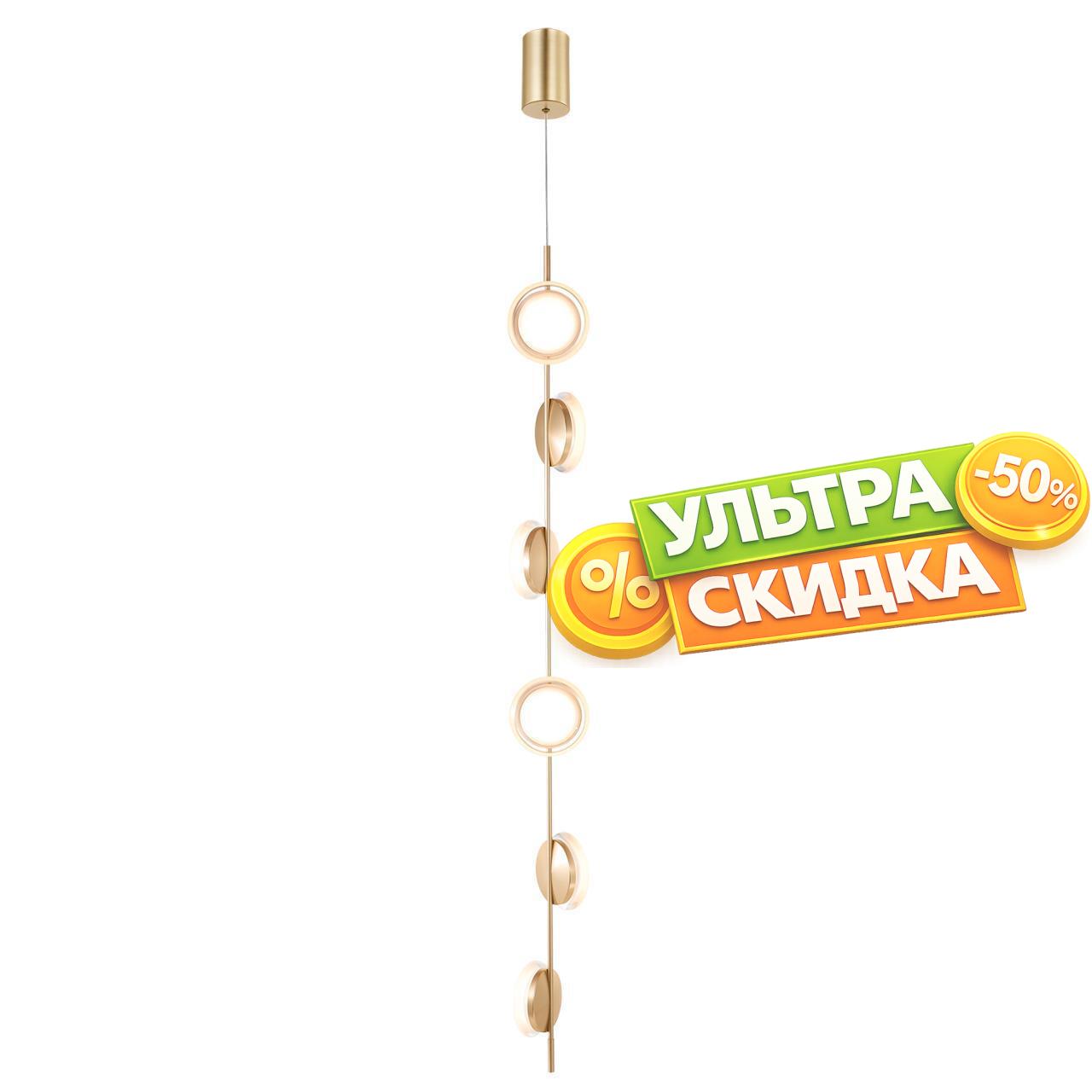 | Описание светильника | Металлический каркас золотого цвета, акриловые плафоны в виде дисков с прозрачным объемным ободком и плоской матовой внутренней частью со встроенным модулем LED, регулируемая высота. |