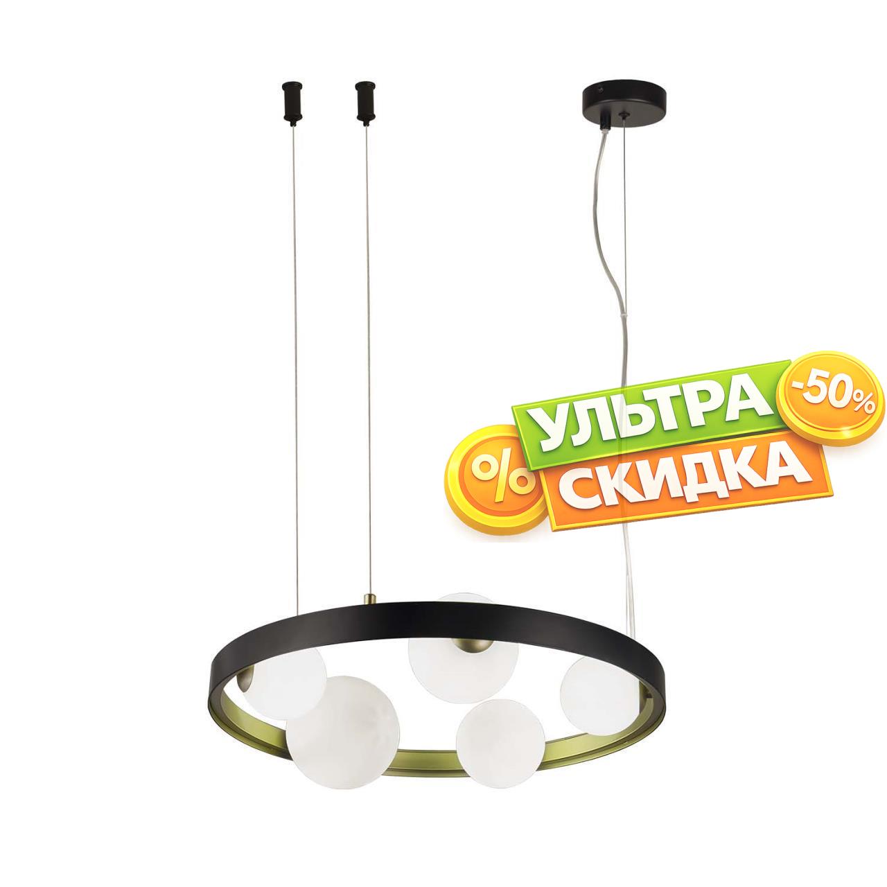 | Описание светильника | Каркас в виде металлического обруча, внешняя сторона матового черного цвета, внутренняя золотого, плафоны в форме шариков разного диаметра из белого матового стекла, регулируемая высота, сменные лампы G9. |