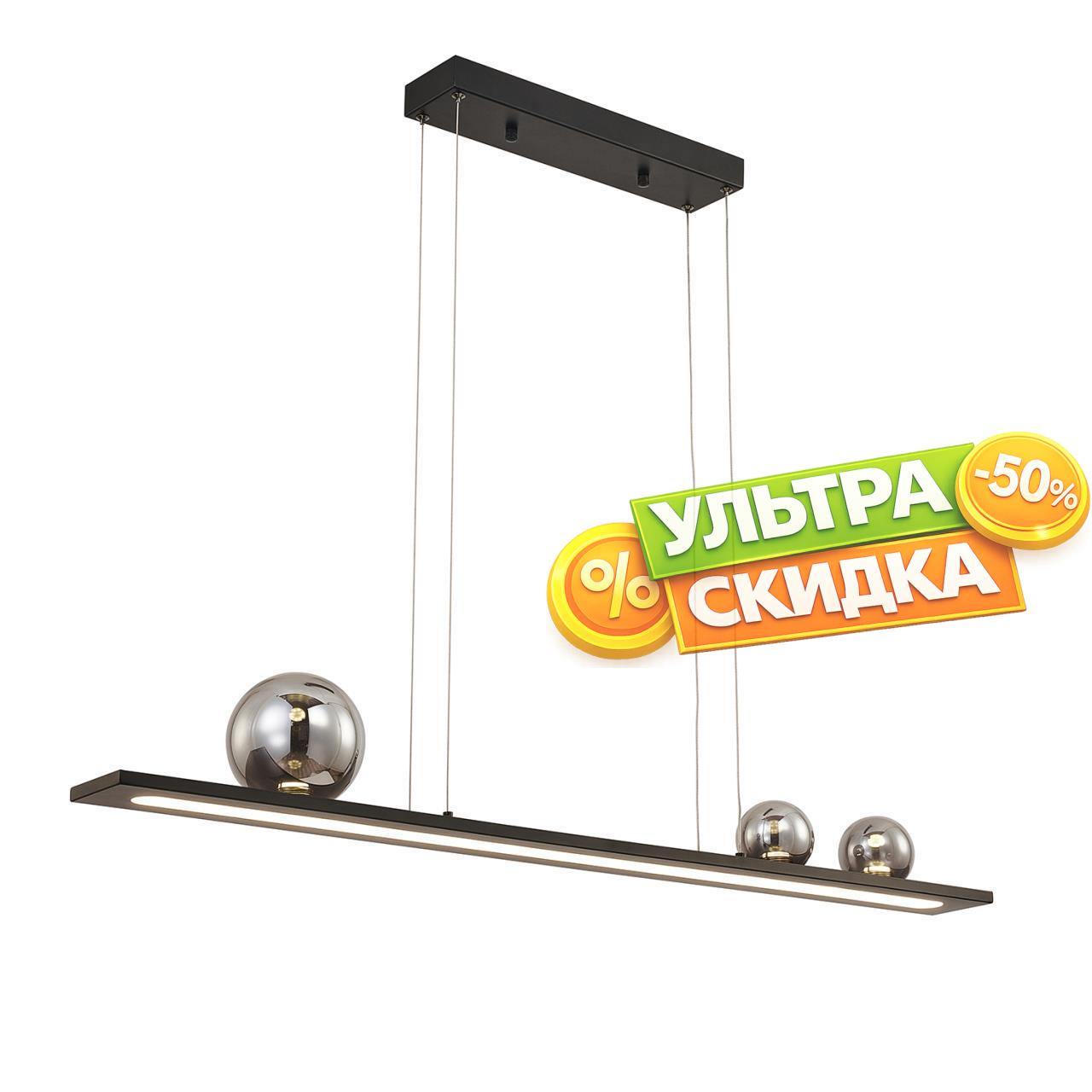 | Описание светильника | Подвес удлиненной прямоугольной формы с каркасом в черном цвете. Основной источник света LED направлен вниз, декоративные зеркальносерые плафоны из стекла, ассиметрично расположены в верхней части и также оснащены встроенными модулями LED. |