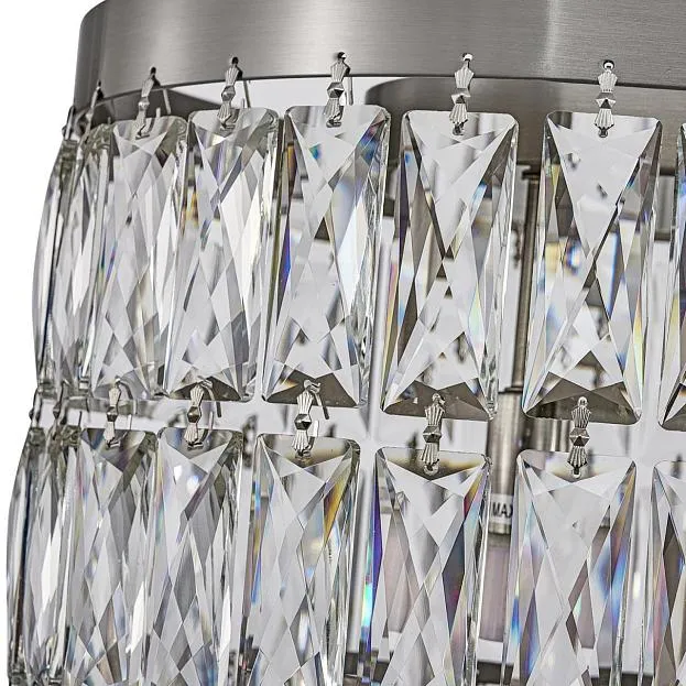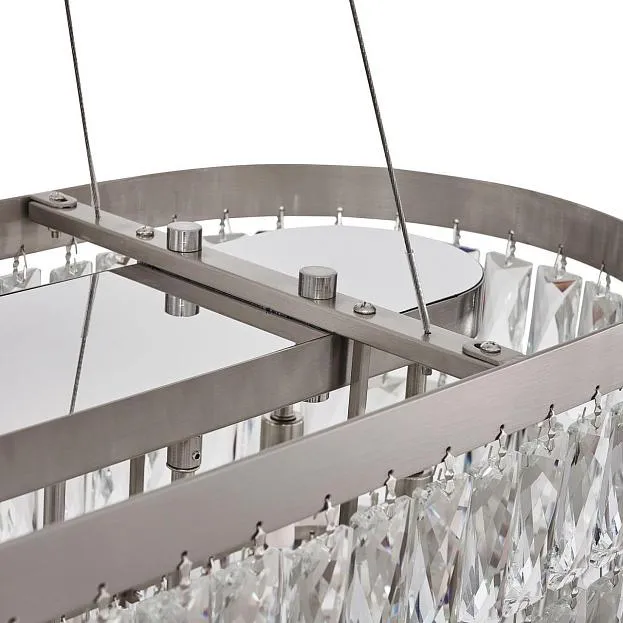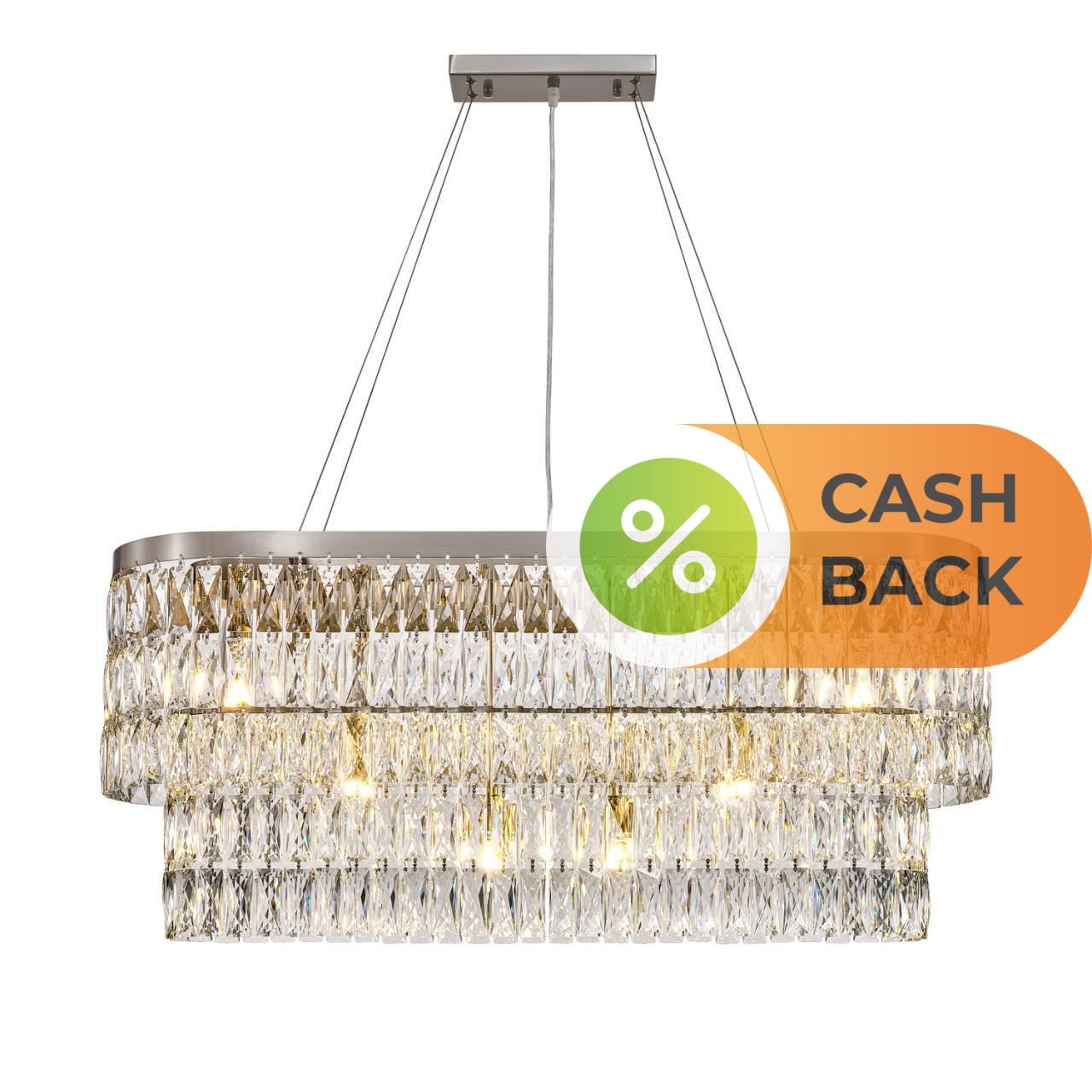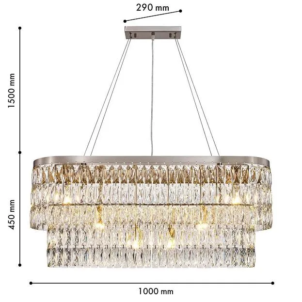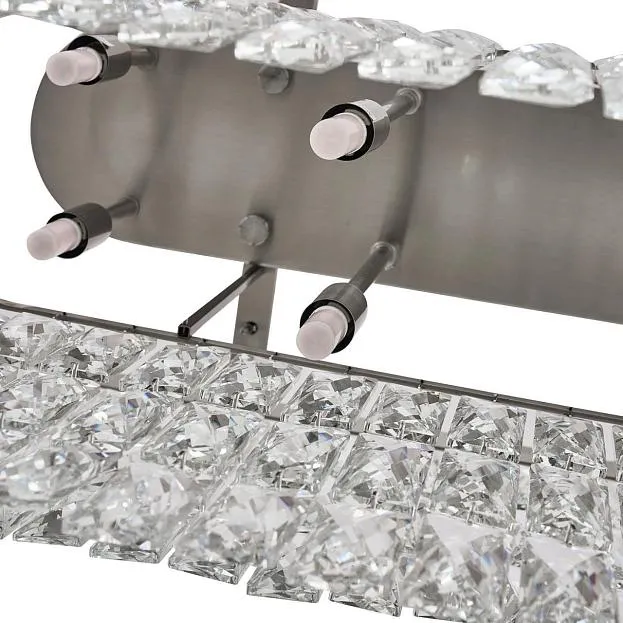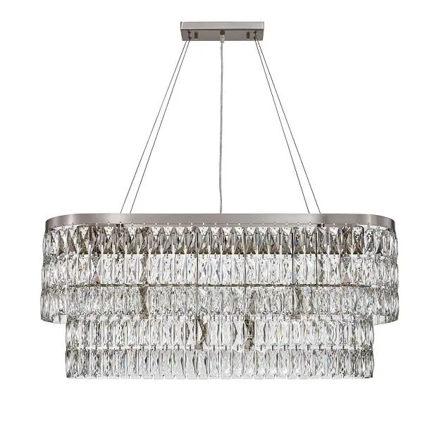 Описание светильника | Металлический каркас в цвете "никель", декор из прозрачных прямоугольников из хрустался высшего качества, регулируемая высота, сменные лампы |