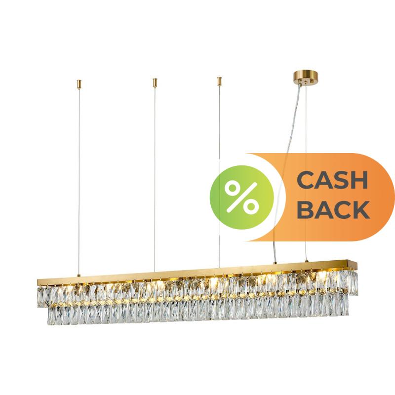 | Описание светильника | Прямоугольный металлический каркас золотого цвета, плафон состоит из прозрачного хрусталя оригинальной формы, часть каркаса фиксируется тросиками для баланса. |