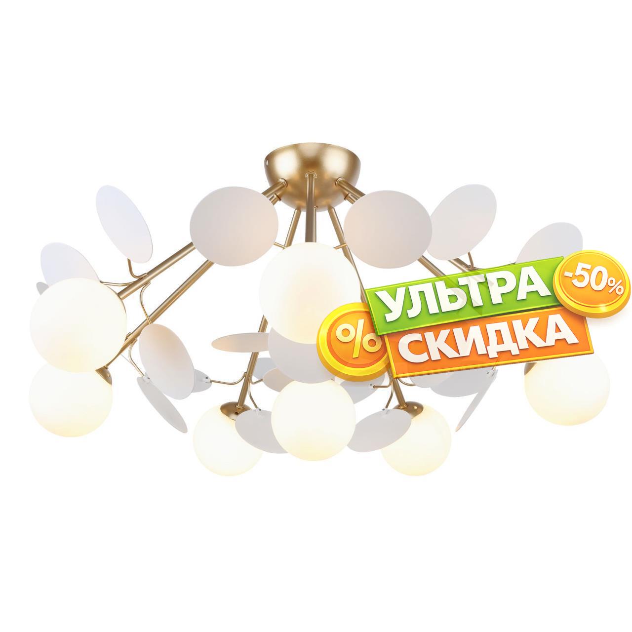 | Описание светильника | Металлический каркас золотого цвета, круглые стеклянные плафоны молочного цвета, декоративные круглые белые пластины. |