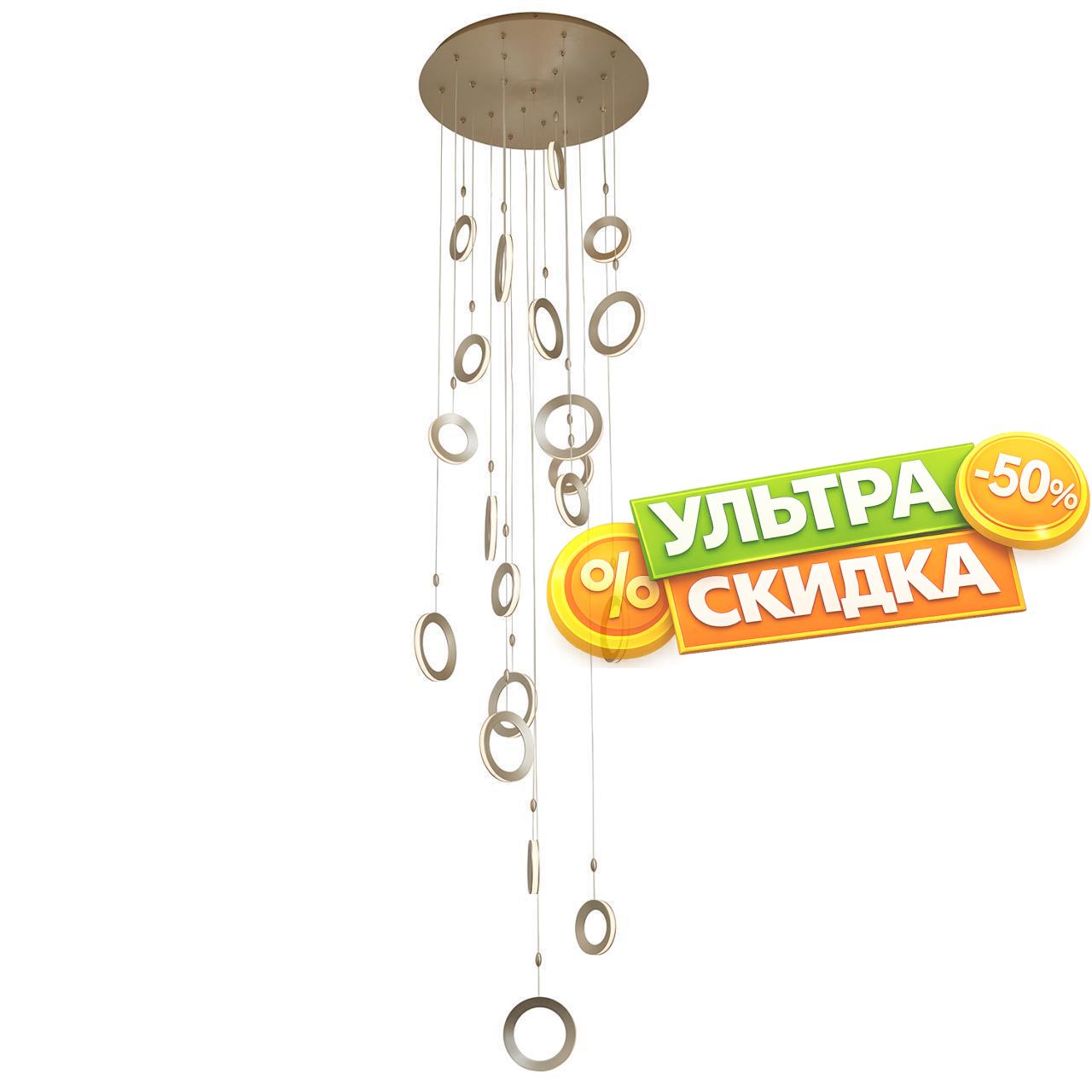 | Описание светильника | Каскадная люстра, каркас цвета матовое золото, объемные кольца цвета матовое золото, закреплены на разной высоте, светятся по периметру благодаря встроенной ленте LED, все подвесы регулируются по высоте. |