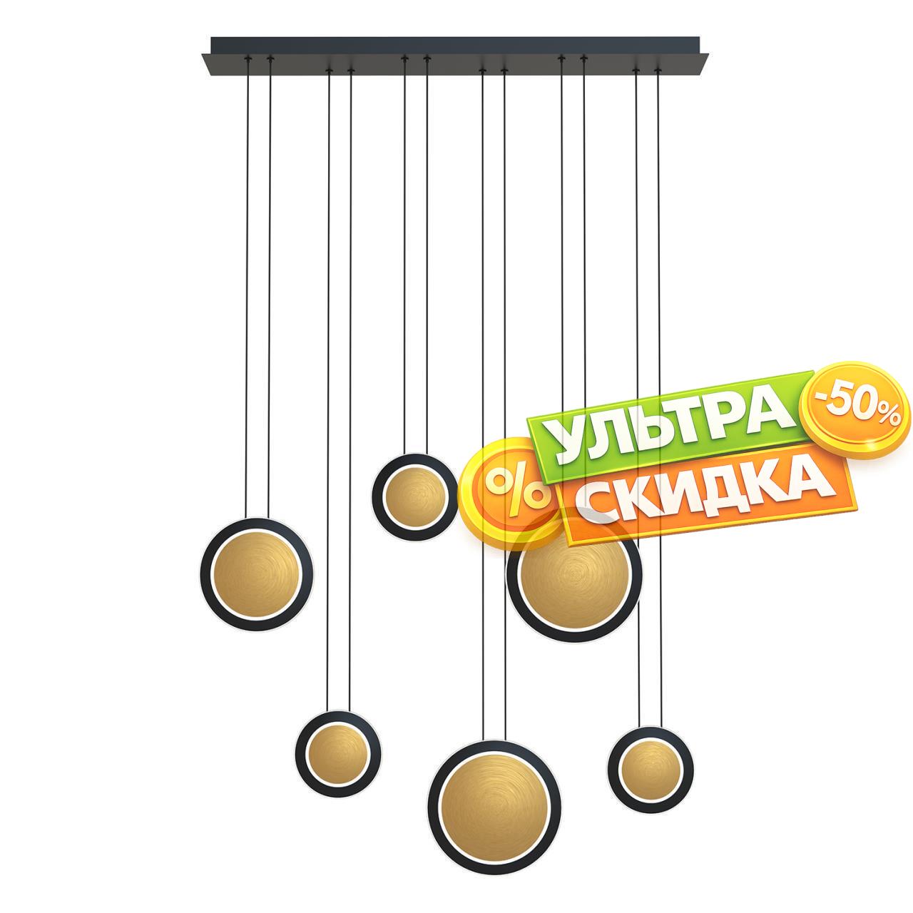 | Описание светильника | Потолочная люстра с каркасом в черном цвете, с 6 плафонами в форме дисков различных размеров в цвете латуни с черным кантом. Каждый диск оснащен тремя встроенными лентами LED, подвешен на двух параллельных струнах и имеет регулируемую высоту. |