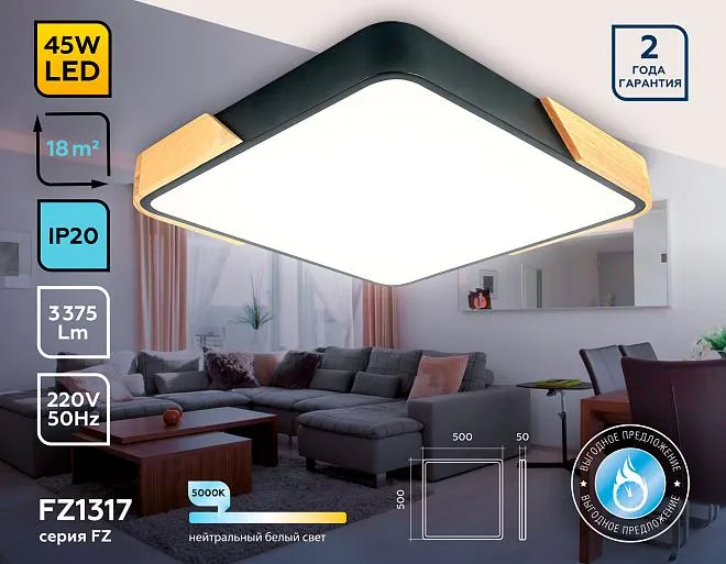 | Доп. Артикул | FZ1317 BK/LW черный/светлое дерево 45W 5000K 500*500*50 (без ПДУ) |
