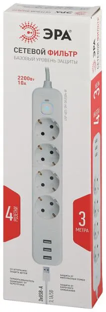 Розеточные блоки, удлинители ЭРА USF-4es-3m-3xUSBA-W