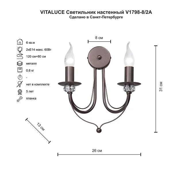 Купить Светильник настенный Vitaluce V1798-8/2A, 2хЕ14 макс. 60Вт в интернет-магазине ЛюстраНаДом со скидкой и кешбеком. Работаем с НДС, доставляем на дом и в ПВЗ. Продажа Vitaluce V1798-8/2A V1798 осуществляется с доставкой по Москве и регионам России.