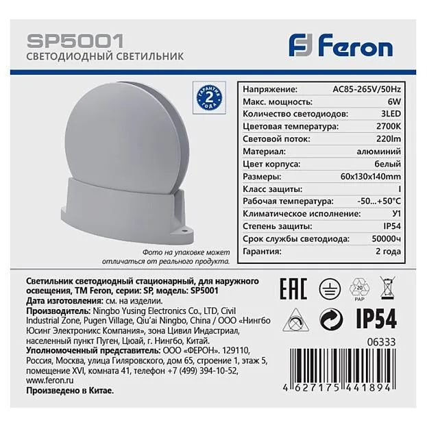 | Название | Светодиодный светильник для архитектурной подсветки Feron SP5001 85-265V, 6W, 2700К, IP54 |