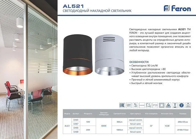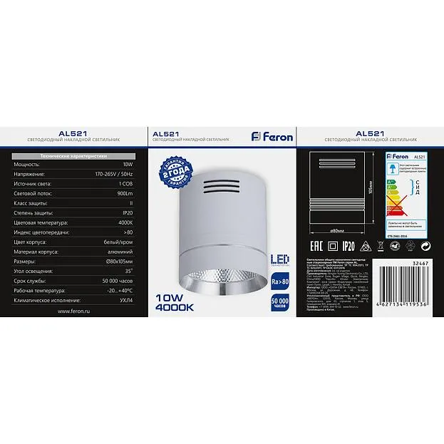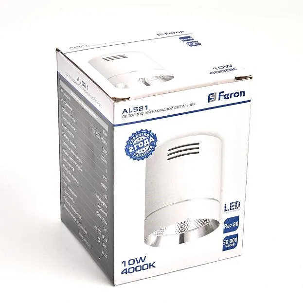 | Название | Светодиодный светильник Feron AL521 накладной 10W 4000K белый с хром кольцом |